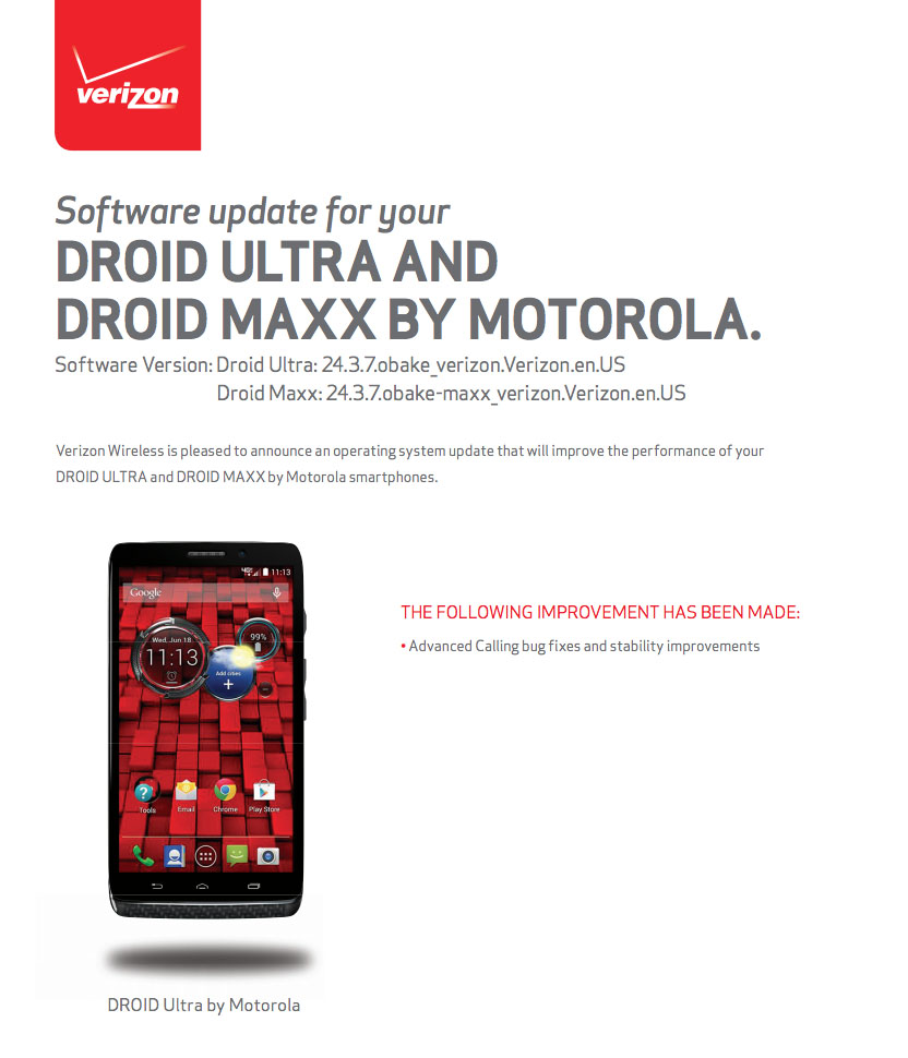 The 2013 DROID family – MAXX, ULTRA, and Mini – is receiving an update today from Verizon to version 24.3.7. The update does one thing, so I hope it does it well. The only item listed on the changelog says that this update brings bug fixes and stability improvements to VoLTE, which Verizon calls Advanced Calling 1.0.