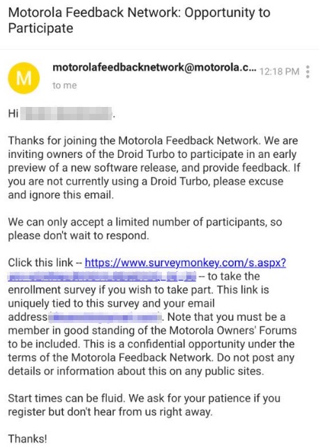 Invites to a soak test of “an early preview of a new software release” for members of Motorola’s Feedback Network who own the DROID Turbo arrived this morning. Is it Lollipop time for Turbo owners? It might be, though the details in the invite aren’t specific enough for us to know for sure just yet.