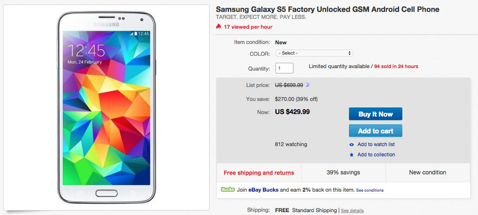 Target (via eBay) is hosting a deal that can land you a brand new Samsung Galaxy S5 (unlocked) for just $429. Since the device is unlocked, it should work just fine at either AT&T or T-Mobile. They appear to be selling through them quite quickly, so only the blue and gold versions are still available.