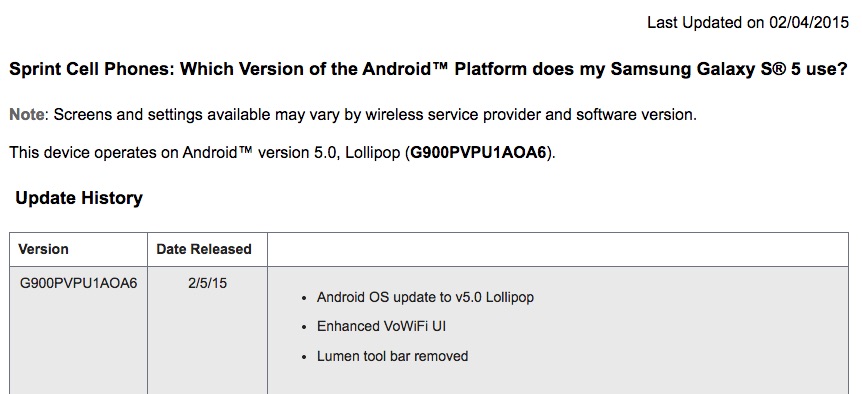 According to Samsung’s FAQ page for the Samsung Galaxy S5 on Sprint, an update to Android 5.0 “Lollipop” should begin arriving as early as tomorrow, February 5. The update drops in as software version G900PVPU1AOA6.