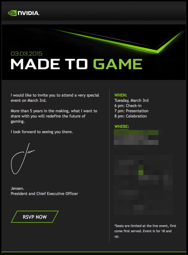 It’s anyone’s guess as to what they will show, but they did note in the invite that this product has been “more than 5 years in the making.” Are we talking a new mobile processor like the Tegra X1 that was demoed during their CES event? Could this be a new SHIELD product? Maybe something related to GRID, their cloud gaming service? Maybe something far outside of those three areas? You tell us.