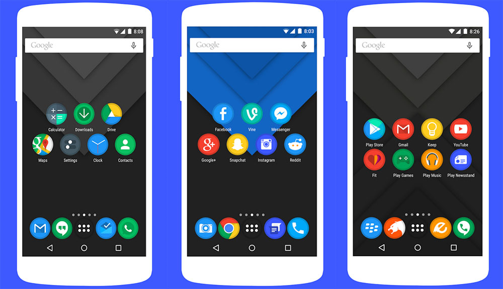 What I really appreciate about this pack, though, are the numerous alternate icons for popular apps. For example, the Mail icon has 12 color choices, Google Messenger has 16 or so, Maps has a few, the Dialer has at least 10, and there are a handful of launcher icons. This is an icon pack designer who gets it. I’d always rather have color choices of the popular icons than 1,500 other HD icons for some random app I’ll never use.