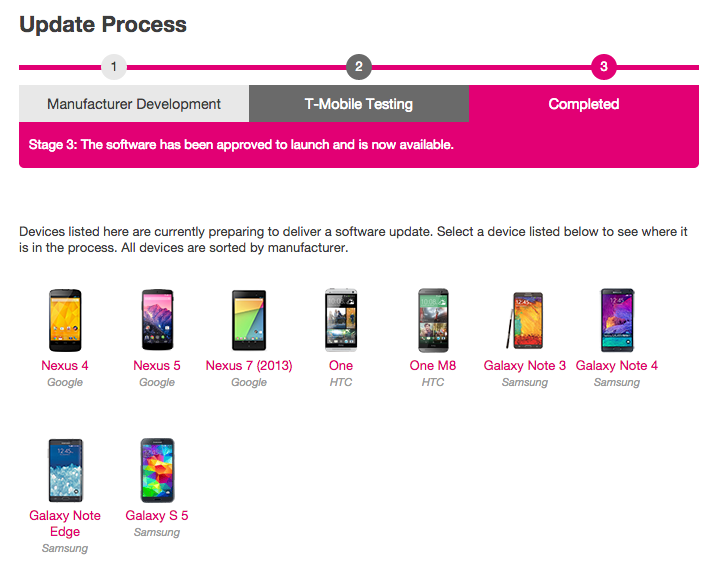 There are three levels of the process – Manufacturer Development, T-Mobile Testing, and Completed. What users will do is click on the device they own, then see just exactly where the update is in the cycle.