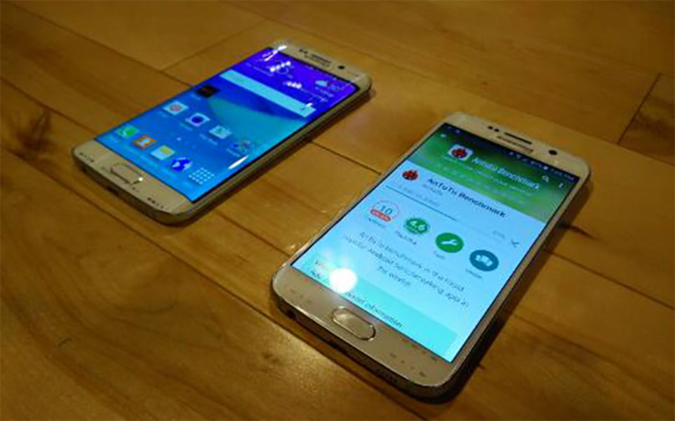 The photos are pretty low quality, but we can see below that the device situated top-left, with the home screen up, has slanted edges on each side of its face, just like rumors suggested it would. This is the Galaxy S6 Edge. The technology here differs a bit from the Note Edge, though, in that the edge displays are showing the same content as the home screen rather than dedicated panel information. That could mean that you are able to toggle edge displays on or off depending on the situation, they have gotten smarter with how they display content, or Samsung ditched panels altogether and is instead just making a phone that looks cool with curved edges. Really tough to tell from a single image.
