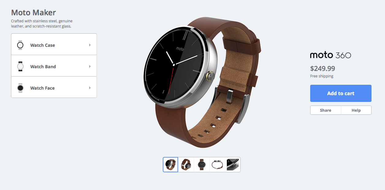 With Moto Maker, you should be able to walk through the process of choosing an individual band (leather or metal), watch color (black, silver, or champagne), set a watch face to load out of the box (apparently there are some new ones to choose from), and maybe more.
