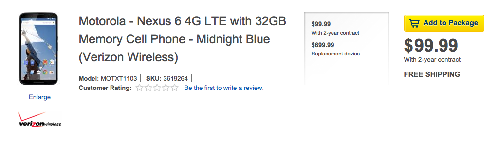 The Nexus 6 is officially available in Verizon stores as of this morning. If you were interested in picking up Google’s new Nexus through Big Red, but were waiting to be able to get one in hands, now is the time. Once you do that at a Verizon store, you may want to walk back out and across the street to Best Buy to actually purchase one, though. Best Buy is currently selling the Verizon variant of the Nexus 6 for just $99 with a 2-year contract. Verizon, on the other hand, wants $250 for it.
