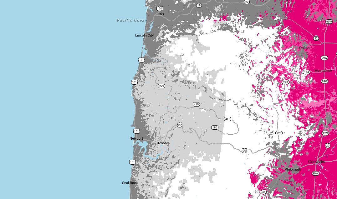 Take for example this picture of the Oregon coast and some of its bigger towns, Lincoln City and Newport. According to T-Mobile’s own map, you’ll be stuck on 2G if you decide to spend a weekend on the beach. This isn’t the middle of Montana that we are talking about here. This is the Oregon coast, a destination for many months of the year that sees thousands and thousands of tourists. Both AT&T and Verizon have full LTE coverage up and down the coast, basically following Highway 101. T-Mobile has zero in these two particular cities, and hit or miss coverage up the rest of the coast in Oregon.