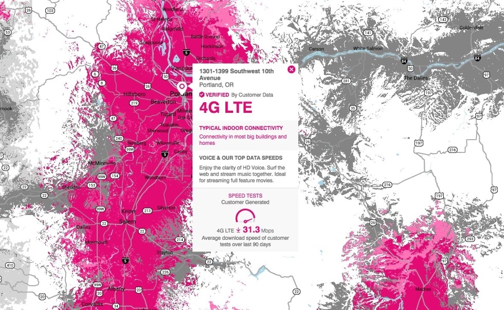 Am I cherry picking this specific section? If that’s how you want to spin it. The point is, I live in Oregon, and like many Oregonians, I travel to the coast often in the warmer months of the year. So because of that, I want to make sure that the places I travel to will have coverage when I travel to them. In this case, it’s not looking good for T-Mobile. Your experience could be very different than mine and you may see great T-Mobile coverage everywhere you travel. But if I were to choose AT&T or Verizon, I wouldn’t even need to check a map at this point because I’m pretty damn sure they’ll have coverage almost anywhere I go. With T-Mobile, I still feel the need to check in the year 2015.