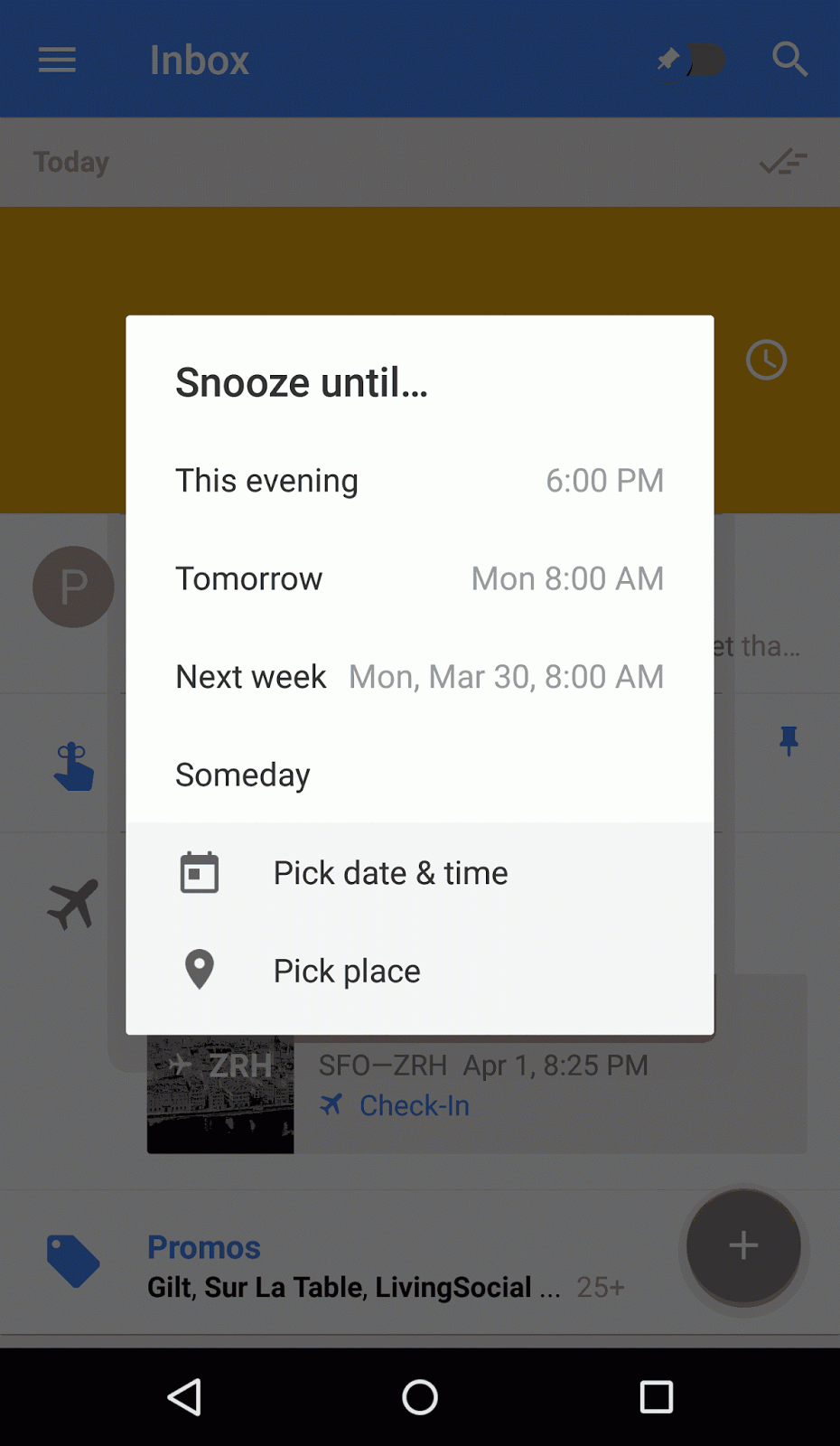 As the Gmail team states, “As our lives change, so do our schedules. ‘Morning’ probably means something different to a college kid than, say, a parent with a newborn baby. Whatever your schedule is, your inbox should adapt to your day (and not the other way around). You don’t even have to do any work: Inbox will adapt to your preferences. If you snooze to a custom time of 7:30AM, you’ll see a prompt asking if you’d like to change your morning time to 7:30AM. One tap and you’re all set!”