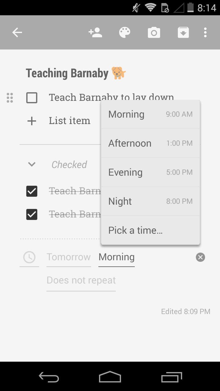 If I want to quickly remind myself about something then I want to say, “Okay Google Now, remind me to pick up dog treats for Barnaby tonight at 7” and have it show up in Google Keep, where I have the rest of my notes and reminders. If I can’t quickly get a reminder in Keep like that then I may as well use a better to-do list app.