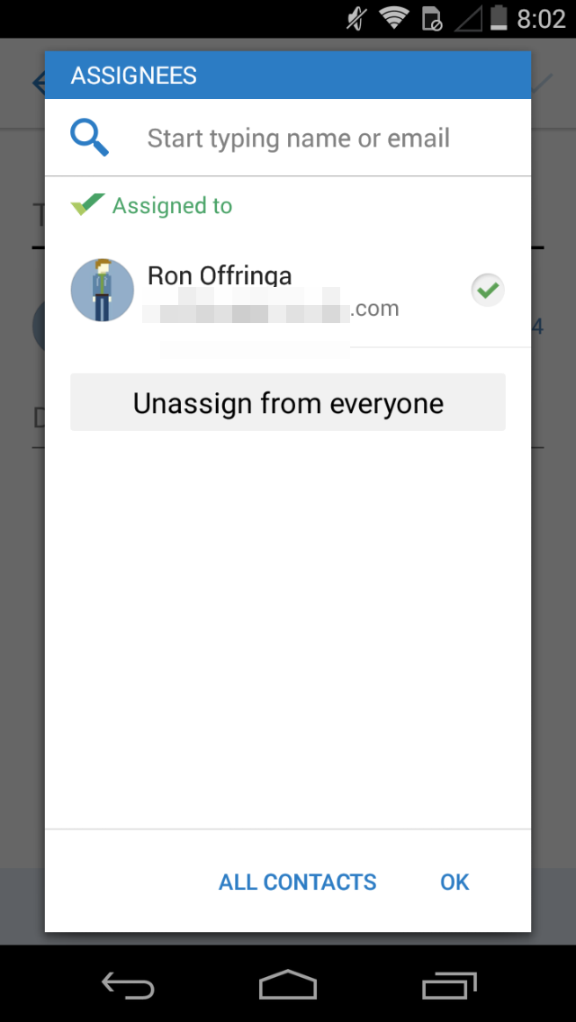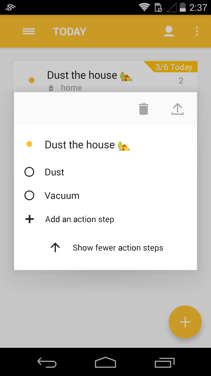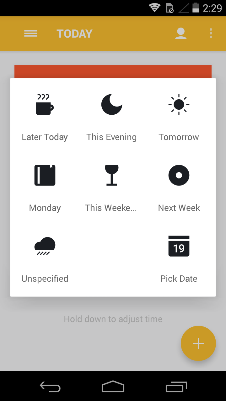 The app has a nice workflow where you swipe between Today, This Week, Next Week, Later, and Completed. Tapping and holding on a task lets you move it between those fields. You can also attach pictures or files (from local storage, Dropbox, Google Drive, or Box) to your tasks. Finally, Wrike includes a notification widget that shows you the total number of tasks you have for the day and lets you add a task for the day from said widget. If you like organizing your tasks by week or want to collaborate with some others on tasks Wrike is worth taking a look at.