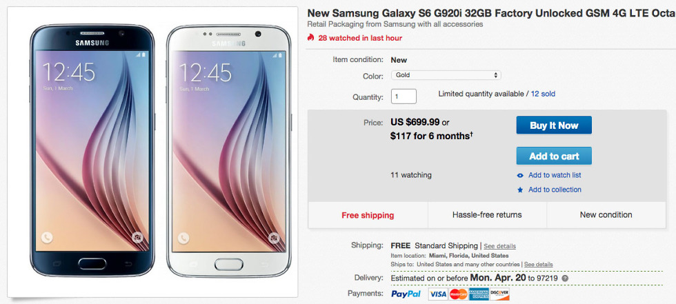 Without a US model announced (and their likely won’t ever be one), we have to turn to sellers on eBay who bring over unlocked international variants. Today, probably for a limited time, you can grab a 32GB model in Black, White, or Gold for $699. This is the SM-G920i variant that, at least according to this listing, works perfectly fine on both AT&T and T-Mobile LTE. The phone supports LTE bands 1, 2, 3, 4, 5, 7, 8, 12, 17. It also appears to support both carrier’s HSPA frequencies.