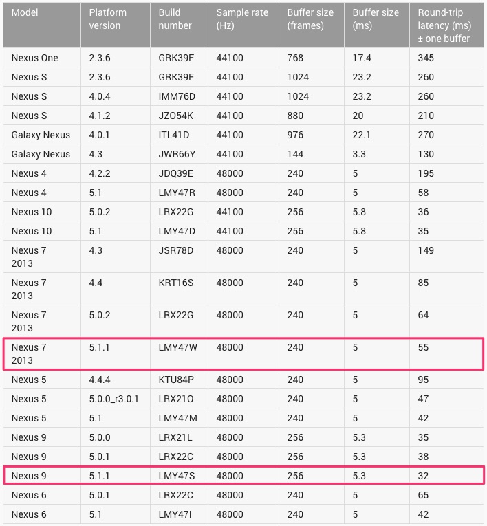 If you look below at the chart we copied from that audio latency page, you will see both devices listed as running Android 5.1.1, though each is also running a different build. The Nexus 7 (2013) is running LMY47W, while the Nexus 9 is running LMY47S.