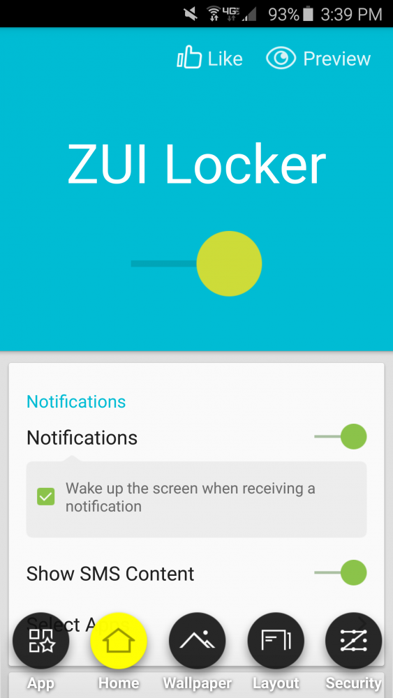 ZUI requires a little more set up than the others for notifications. By default it will select certain apps, but you can (and should) go into settings to customize this so that you see the notifications you want to see. ZUI defaults to lighting up when you receive a new notification. Swiping the notification to the left dismisses it, but to the right opens it. Swiping from the bottom of your lock screen reveals shortcuts to your favorite apps, settings for the lock screen such as wallpaper, as well as toggles for WiFi, sound, flashlight, brightness, etc. Tapping and holding on the lock screen reveals shortcuts to your dialer, flashlight, wallpaper, and settings.