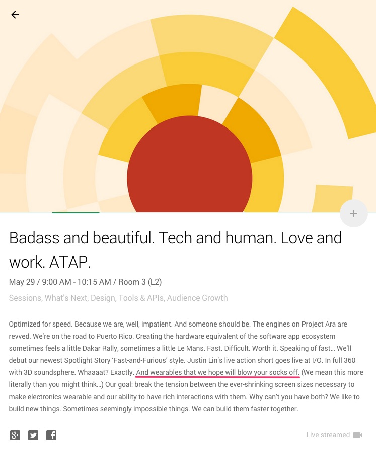 From there, the session description talks about breaking the tension between the “ever-shrinking screen sizes necessary to make electronics wearable and our ability to have rich interactions with them.” So, smart sandals that have touch screens? That’s obviously a joke, but I really am lost at this point. No matter what, we are expecting wearables of some kind from the ATAP team, and that’s good news.