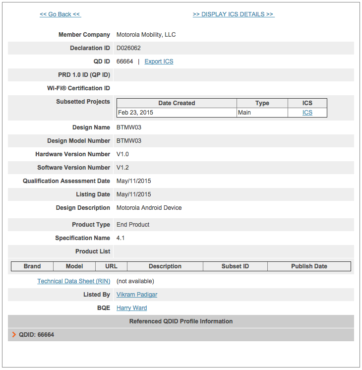 According to a listing on Bluetooth SIG’s website, a product made by Motorola under the design model number BTMW03 was assessed yesterday. Of course, the listing doesn’t reveal many details, other than the fact that it is equipped with Bluetooth 4.1 and is a “Motorola Android Device.” What we do know is that last year’s Moto 360 was listed under design model number BTMW01, which is too damn close to this product’s design number to be something completely different. It’s also listed as an “Android” device, so we aren’t talking about a speaker or headset or Moto Stream audio product.