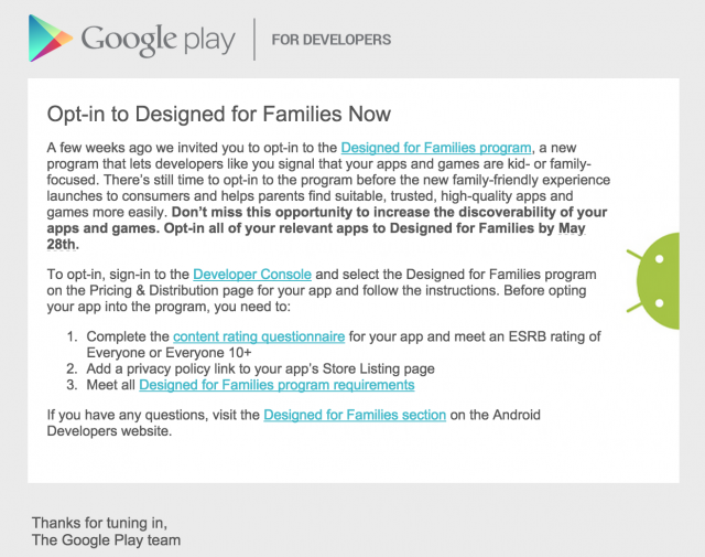 According to a reported email from Google to app developers, the company may soon release its kid-friendly, family-focused version of Google Play during this year’s Google I/O. Previously announced by Google back in mid April, Designed for Families helps curate content made for children and families, such as games and educational applications.