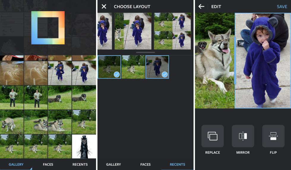 When making a collage, you can have up to 9 photos selected, plus there is a face recognition tool that will highlight photos with faces in them. Once you have the layout you want, you can save the collage as a single photo to your gallery, sharable through any application on your phone.