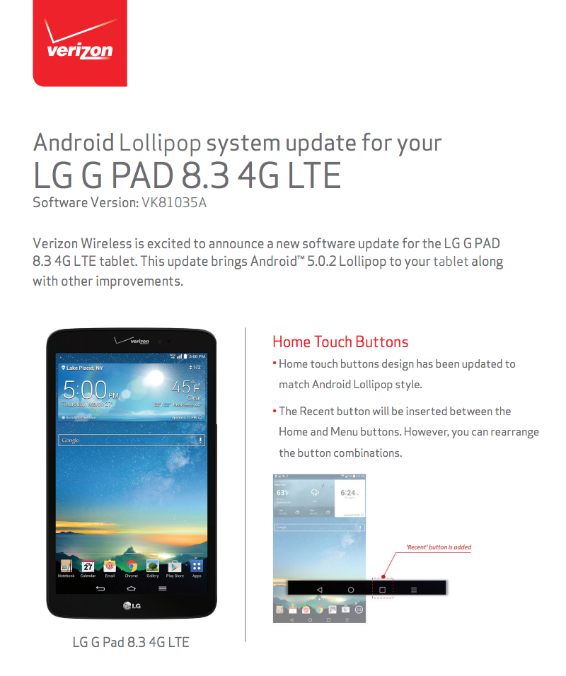 The LG G Pad 8.3 LTE on Verizon is the newest device to receive an update to Android 5.0.2 Lollipop. The update will rollout as version VK81035A, for those keeping track.