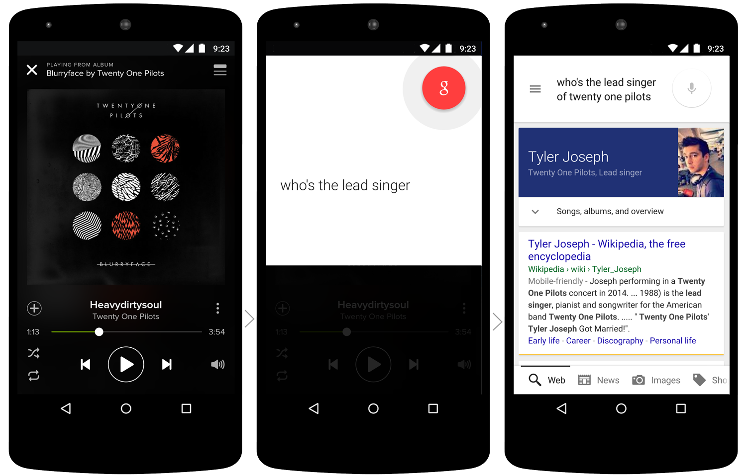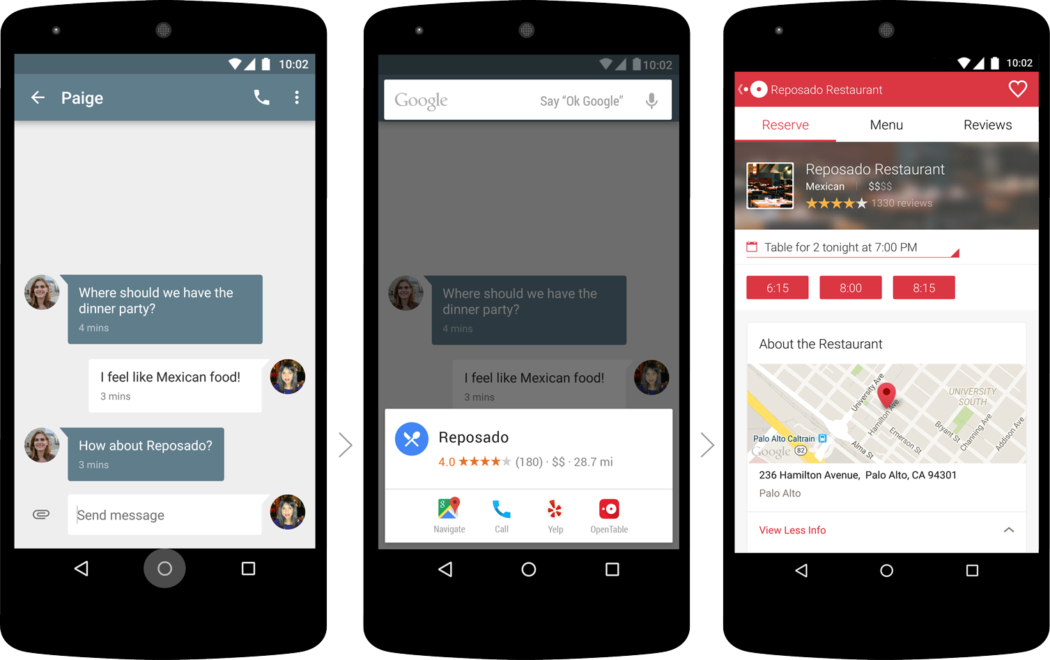 Google Now on Tap could also give you dinner information about a restaurant you were talking about in a messaging app or tell you the names of band members that are currently playing in your music app, all without ever leaving your current screen.