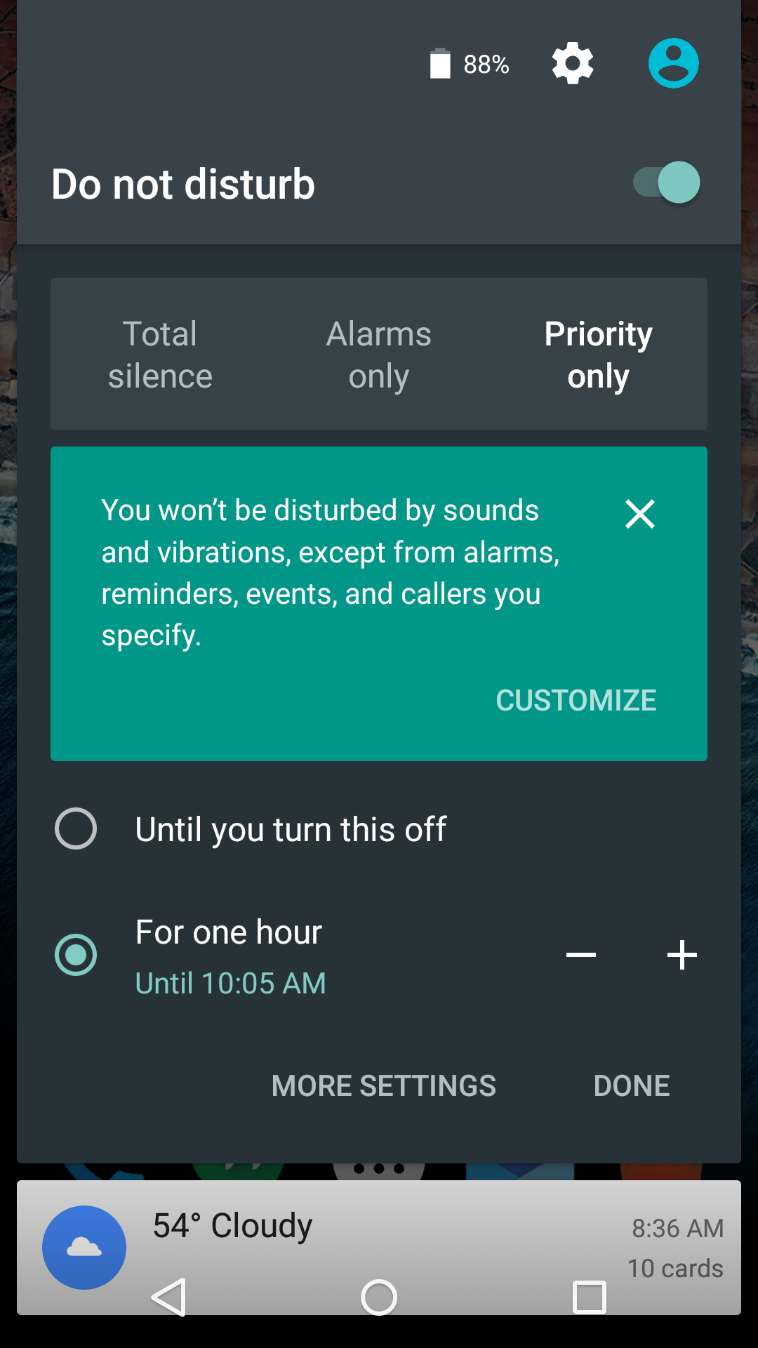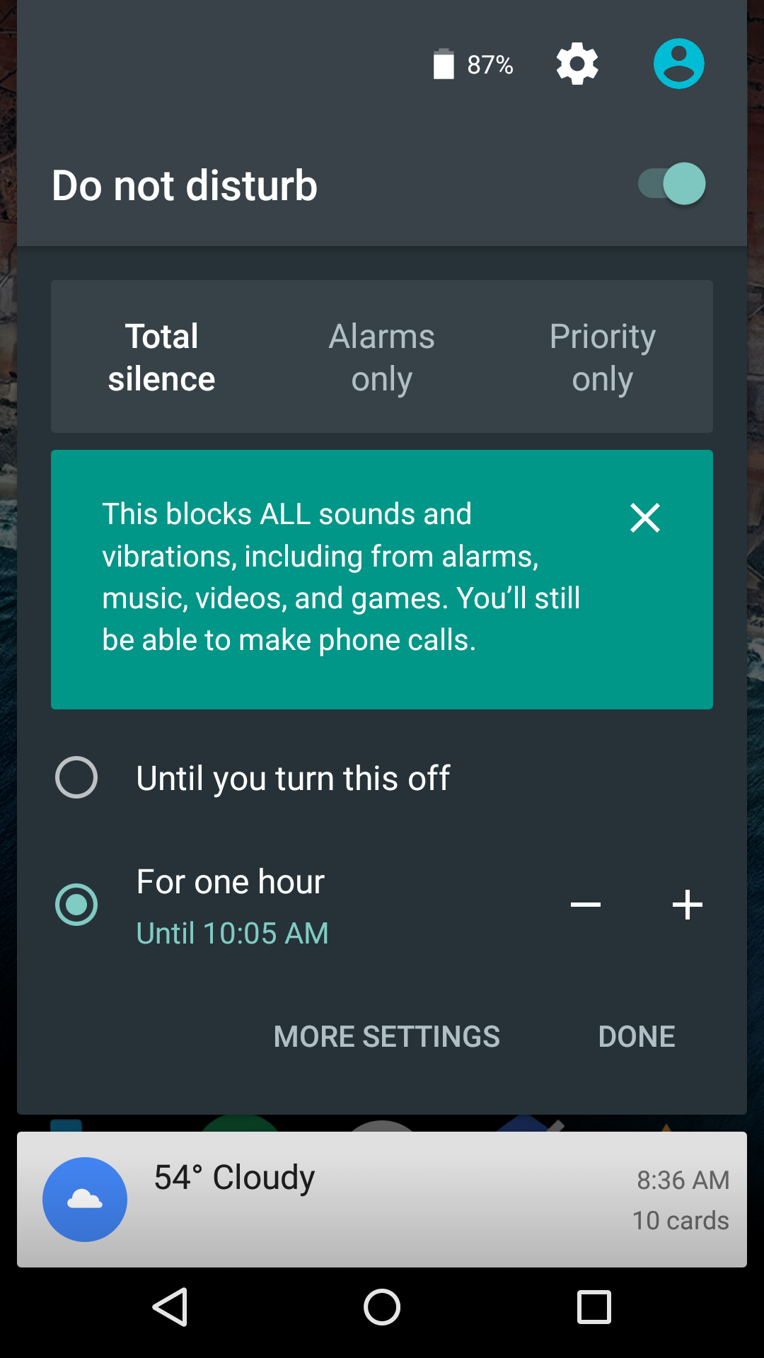 Depending on the option you choose, you can set each to stay until you “turn this off” or specify a time through hourly increments. If you need more settings then that, you can tap “More settings” and get into a deeper view of Do Not Disturb. This is also where we are seeing new features arrive.
