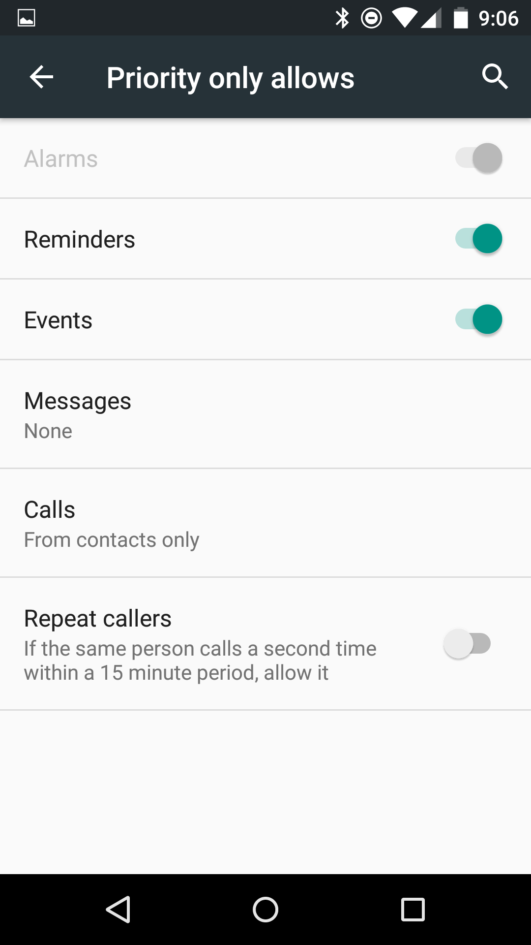 Once in “More settings,” you have two areas to jump into – “Priority only allows” and “Automatic rules.” In “Priority only allows,” you get a familiar set of settings for DND that let you decide what comes through when in Priority Only mode. There are options for reminders, events on your calendar, or messages/calls from select groups of people. One new entry has arrived with Android M and that’s “Repeat callers.” Repeat Callers is as it sounds, a feature that lets someone who calls you over and over again a pass through your DND mode as it may be an emergency.