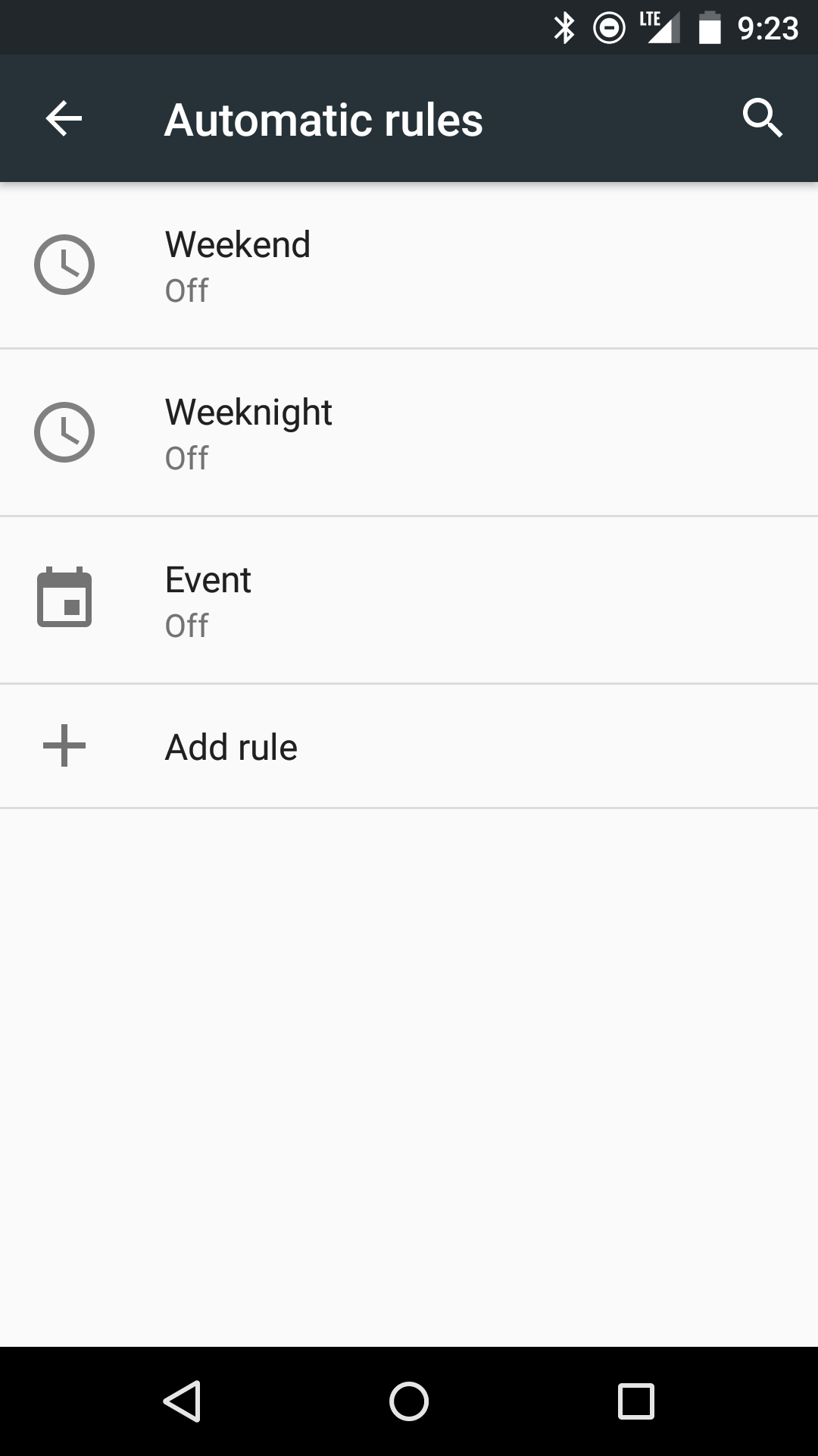 Finally, with “Automatic rules” you get a designated area for setting up automatic DND profiles. There are pre-set rules for Weekend, Weeknight, and Event, to help get you started on automating your Do Not Disturb settings. As you know from Lollipop, these rules try to automate DND by letting you decide set times or days (or based on events) when your phone will remain silent. If none of those work, you can manually setup your own automatic rules based on either time or events.
