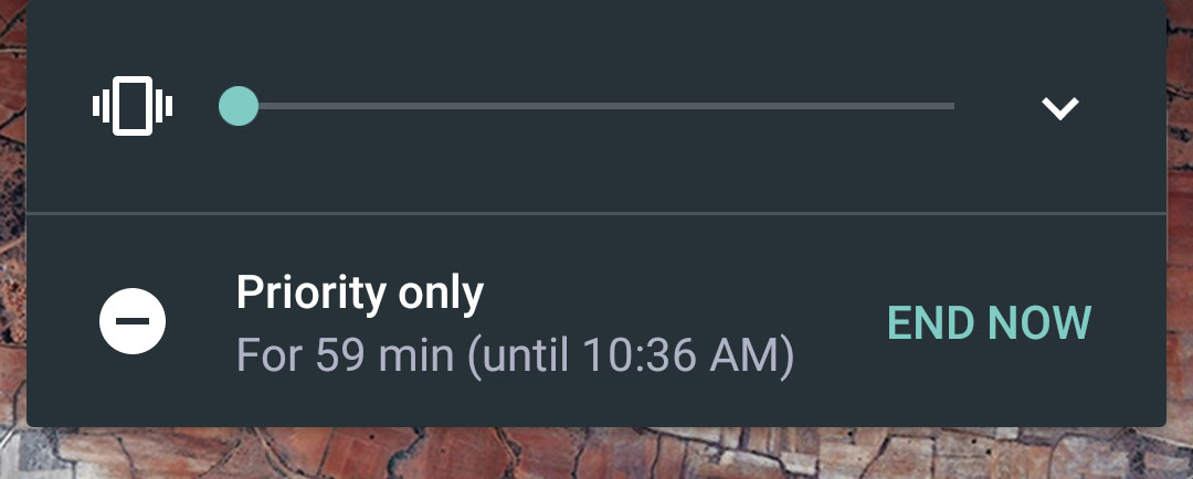First of all, Do Not Disturb (DND) mode is now no longer a part of the volume controls. Well, for the most part. Instead of showing options for None, Priority, and All when adjusting the volume, like you saw in Lollipop, the volume slider is now without DND options unless you had previously set some sort of DND mode. If you have, the slider will let you “end” whatever DND mode has been set. Otherwise, volume is volume and DND is a separate entity altogether.