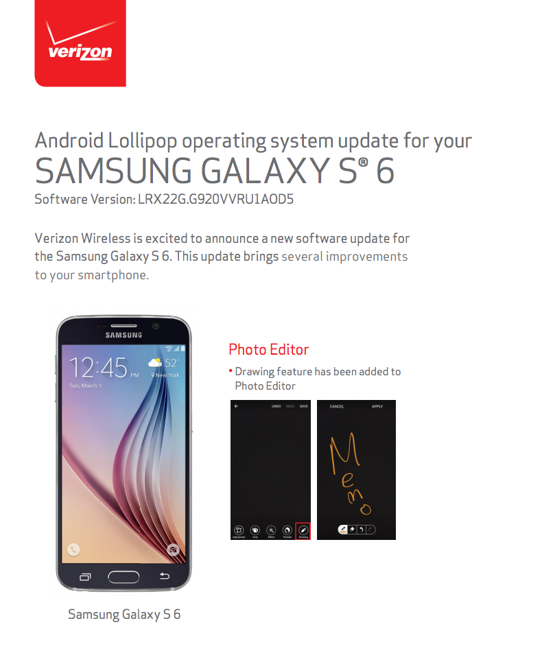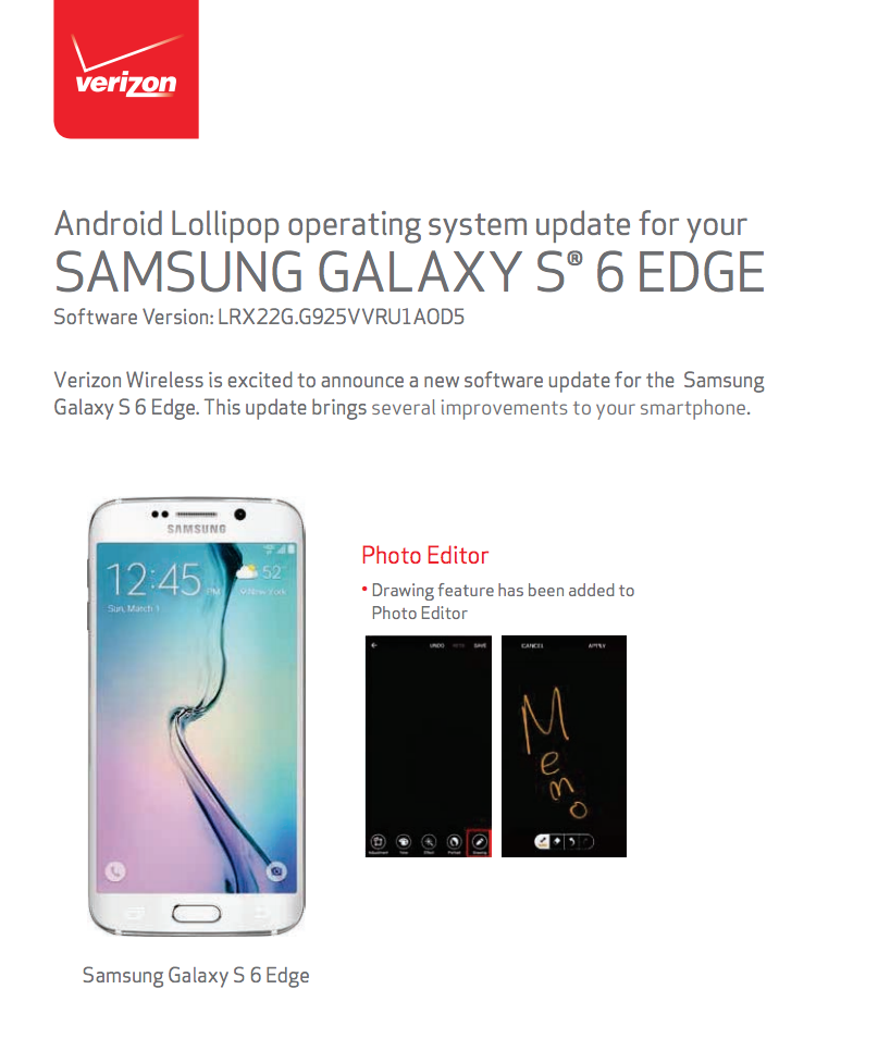 Verizon and Samsung have readied updates for the Galaxy S6 and Galaxy S6 Edge this morning as software version VRU1A0D5. You would be safe in assuming that this is mostly a bug fixer, but there is at least one new feature in the photo editor.
