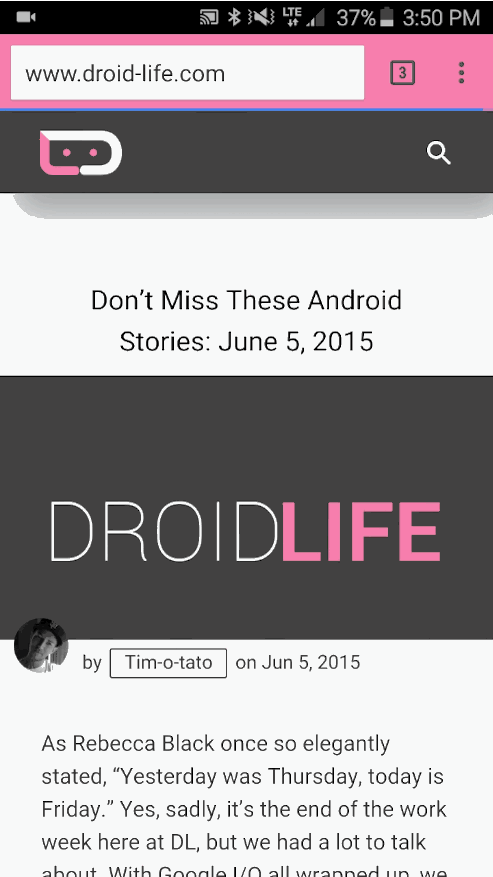 So what’s happening? Good question. To get them to appear, you need the newest version of Chrome Beta and a website that has colored toolbars enabled. Ours is a good place to start. With a tab open, open another tab for another website. Let that website load and then swipe back over to Droid Life. Boom! Pink! So much pink. (We were able to replicate this on two Galaxy S6s, an Xperia Z3 Compact, and our reader’s Moto X (2013).)