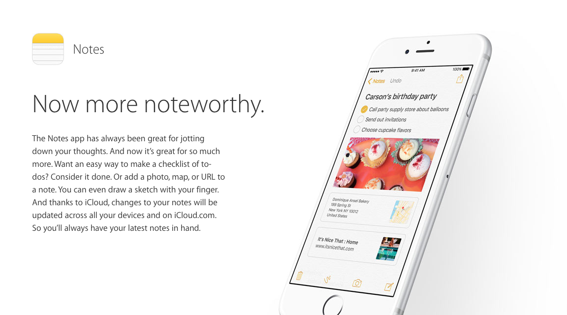 The new Apple Notes app has been given a new lease on life with new features like, photos in notes, checklists, and URLs in notes. Wait, seriously? This app had none of that previously? Those seem like super standard note-taking features in 2010, let alone 2015. The app does finally sync everywhere, thanks to iCloud integration, lets you doodle in white spaces, and can be launched from new places through the Share button for quick notes.