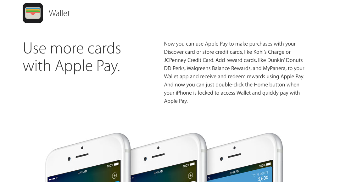 Apple introduced Apple Wallet today, which as far as I can tell, is just a re-brand of Passbook. The new stuff here is the fact that you can add Kohl’s Charge and JCPenney credit cards, along with reward cards for Dunkin’ Donuts, DD perks, Walgreen’s Balance Rewards, and MyPanera. They are also adding a double-click option to launch Apple Pay when at the lock screen for quicker payments.