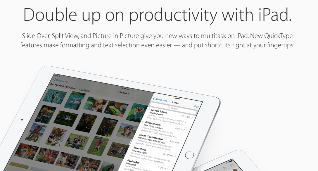 Apple is bringing multi-tasking to the iPad through a suite of new features. The first is called Slide Over, and while Apple is careful to not reveal too much about it, it basically sounds like a way to slide over an app through a notification to quickly interact with before sliding back away. With Split View, you get as the name suggests, a split view with two apps running at the same time. Finally, there is a Picture-in-Picture mode that lets you watch a video on top of whatever you are currently working on. You can drag the movie window around, resize it, pause or play, and eventually stop it.