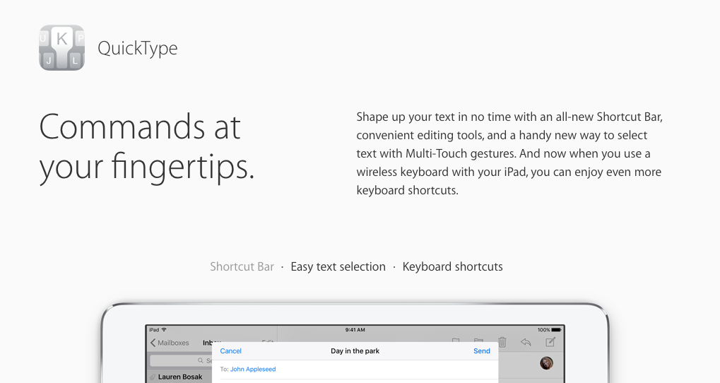 Apple improved the keyboard on iPad in iOS 9 to include a shortcut bar with user-specified shortcuts to tools (like bold, italics, underline, copy, paste, etc.), added a two-finger gesture that turns the keyboard into a massive trackpad, and included keyboard shortcut support for wireless keyboards.