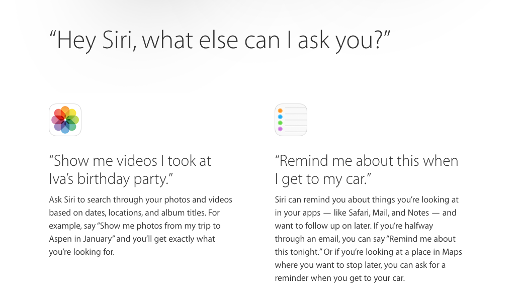 Second, Siri and search attempt to help you automatically as you progress through a day. It could be by showing you shortcuts to contacts you are about to meet with, apps you use at this time every day, nearby places to eat/drink/shop, or news based on your location.