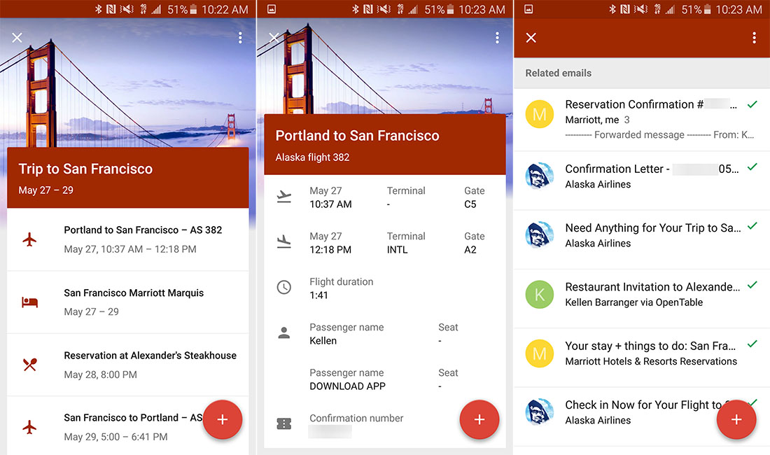 In a bundle, as you can see from this bundle (below) that was created for my trip to San Francisco for Google I/O, Google presents to you a card with a list of all of the reservations you have related to your trip. For me, it has my flight to and from San Francisco, plus hotel and dinner reservation info. I can tap on each item to see an expanded view. In the flight card, I get departure time, terminal and gate info, how long the flight will last, and even my confirmation number. It will even update automatically if I receive a notification that the flight has changed or is delayed. That way, as I check in to my flight or make my way through security, I know exactly what I need to know at all times without having to dig through my inbox.