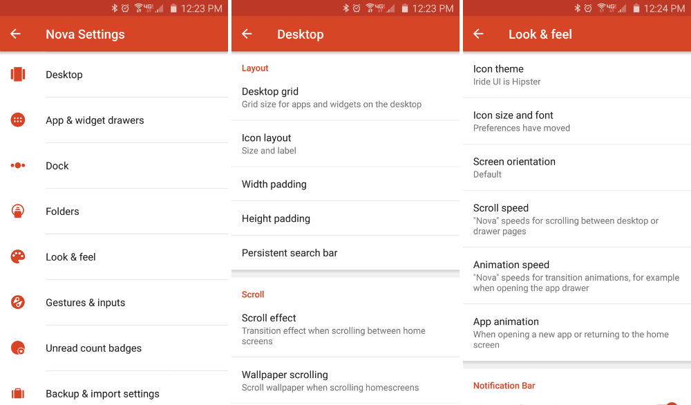 Nova allows for the usage of 3rd-party icon packs, but not only that, settings for the home screen, app drawer, and gesture controls can be set however we like them, granting us power over how we want our phone to look and essentially operate. In the settings menu of Nova, you can tweak desktop, app drawer and dock appearance, badge counts for icons, gesture controls, and even backup or import your settings from another launcher.