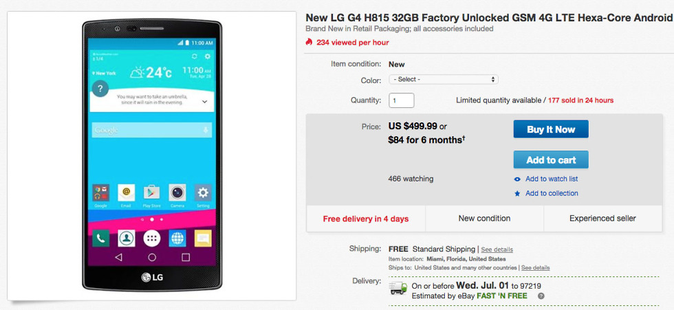 A deal running since yesterday over at eBay has the LG G4 priced at just $499. That’s a solid price on a phone that is arguably as good as Samsung’s Galaxy S6 in most categories and may beat it in some (battery life would be an example). Verizon wants $550 for it, while T-Mobile and AT&T each want $600 and $630, respectively.