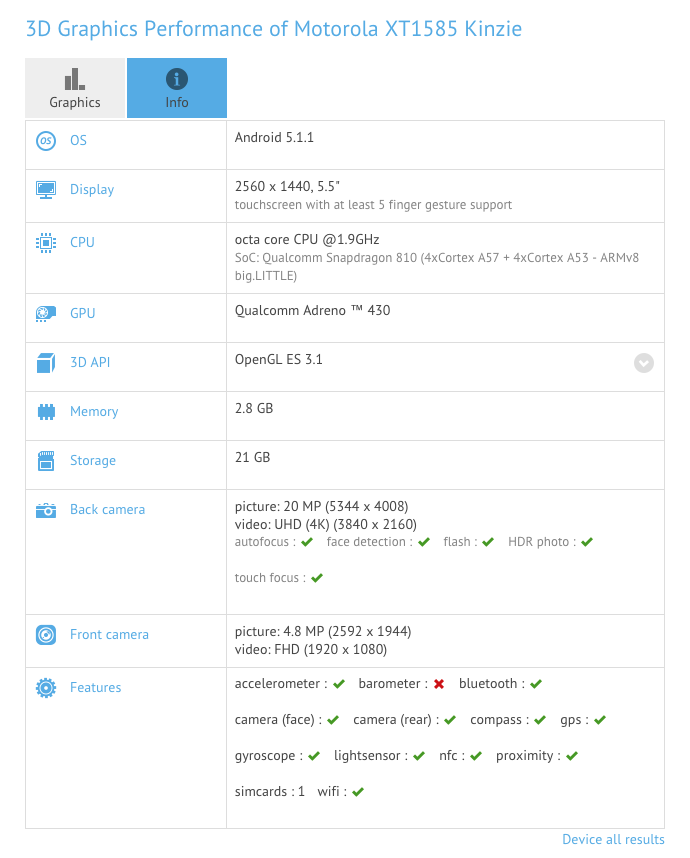 The specific device that showed up is the XT1585, which is carrying a codename of “Kinzie.” The benchmark reveals a phone that has a 5.5-inch QHD (2560×1440) display, Qualcomm Snapdragon 810 processor, Adreno 430 GPU, 3GB RAM, 21GB storage (which probably means 32GB), 20MP rear camera, 4.8MP front camera, and Android 5.1.1. Sounds decent, right?