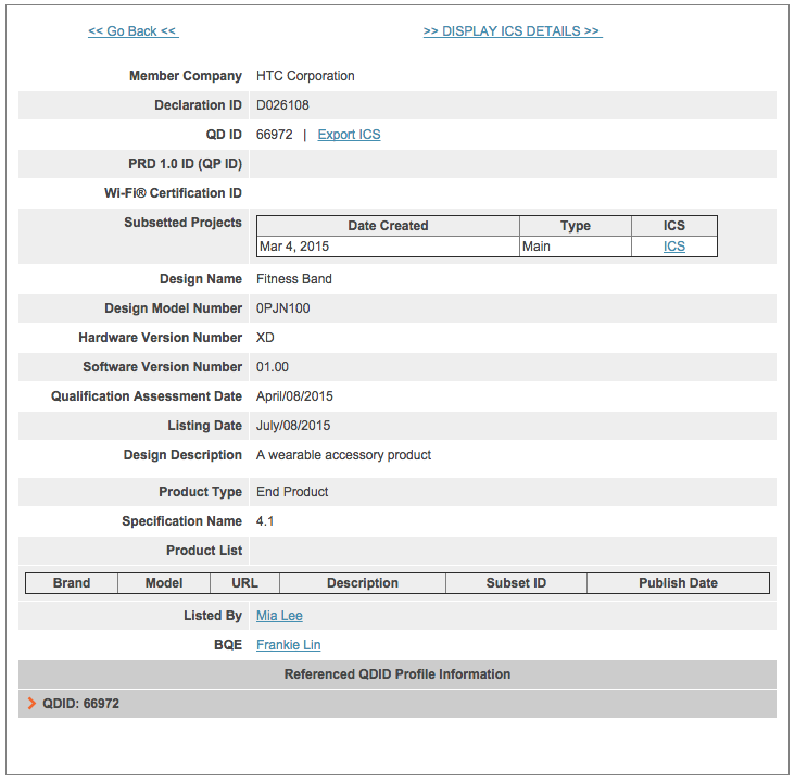Anyways, I bring it up today because it appears to have stopped off at Bluetooth SIG for certification within the last couple of days. The product is a “fitness band” made by HTC that was created at some point around March 4, according to this listing. That certainly makes sense, since the HTC Grip was announced on March 1.