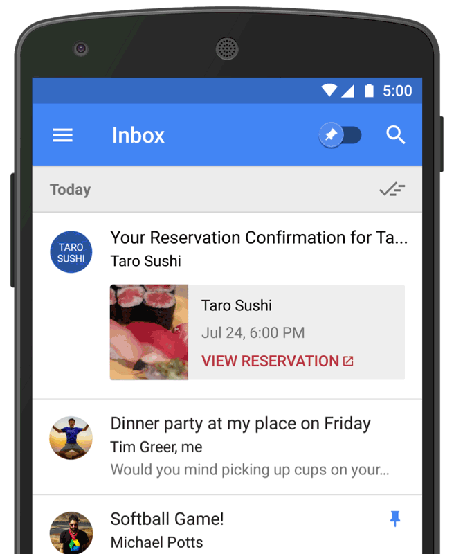 Through the latest version of Inbox, you can swipe left to snooze select emails and quickly tell them to snooze to much more convenient times. For example, restaurant reservations can be told to snooze until an hour before your dinner. Your flight reservations will see an option to snooze until the day before you board the plane. Your hotel reservations can be snoozed until the day you check-in. That way, those important emails re-appear at the top of your inbox just in time.