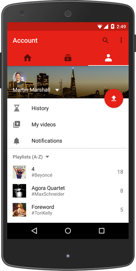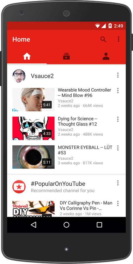 The new app ditches the slideout navigation menu for three tabs or columns of Home, Subscriptions, and Account. Those names are pretty self explanatory, but the basics are you get to explore and discover videos with recommendations on your Home, find the latest from your subscriptions on the Subscriptions page, and check out your own account or upload new videos in the Account page.