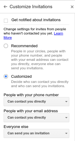 You can see a preview of the new settings below, assuming you haven’t received what we can imagine is server-side switch to them on your phone or tablet. The image shows everything bundled together, with a “Recommended” button helping you take Google’s advice on how your invitation settings should work. Otherwise, you can go “Customized” and pick and choose how you receive invitations for chats.