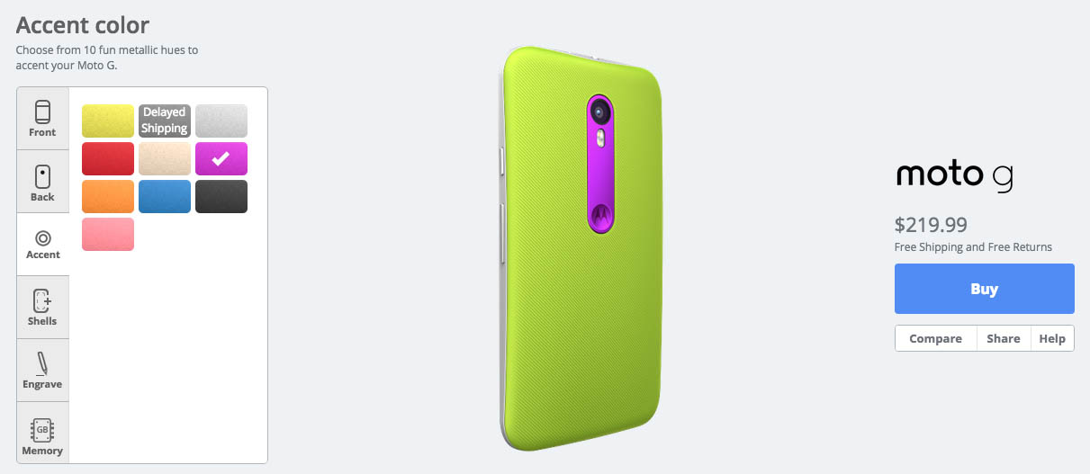 As an added bonus, Motorola added the new Moto G (3rd gen) to their Moto Maker service, which means you can customize a Moto G at no extra cost and receive it within a few days. This isn’t the full Moto Maker treatment that accompanies the Moto X package, but you do get to choose a white or black front and from 10 different accent and back colors. You can even choose to engrave it or double the RAM and storage, though the RAM and storage upgrade will cost you extra.