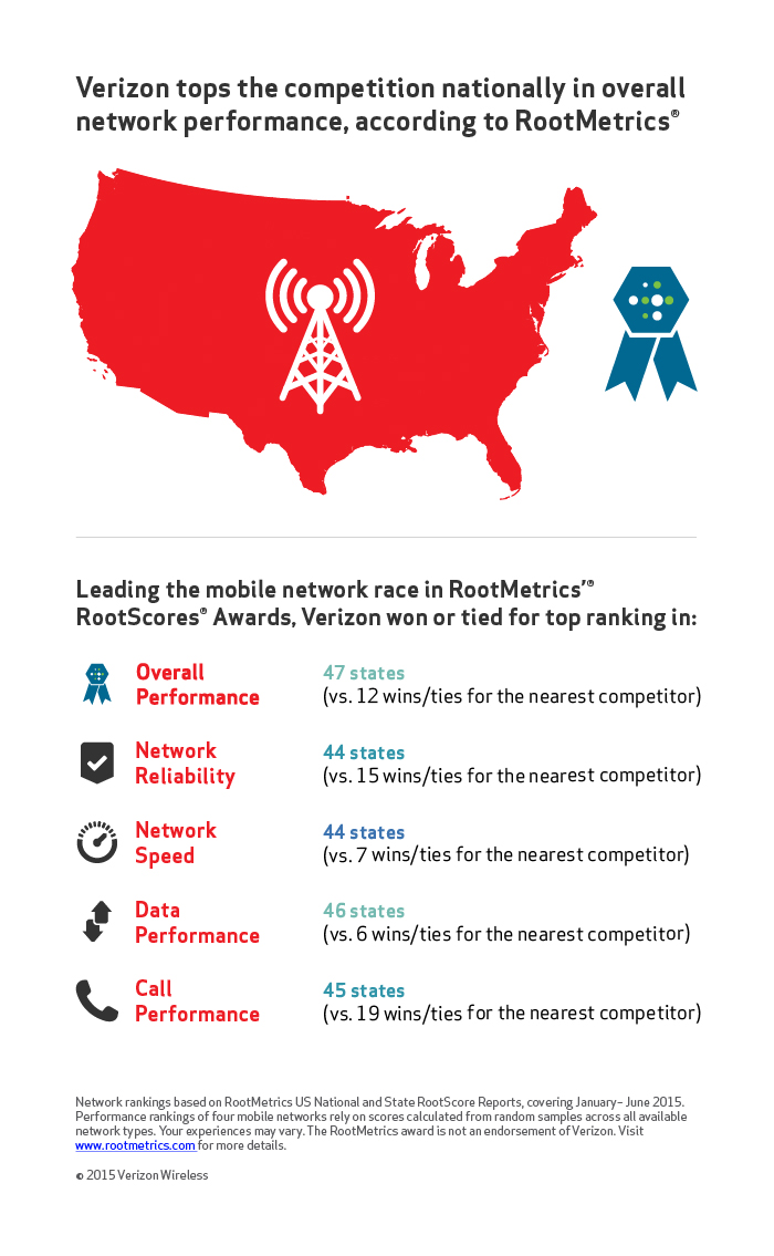 RootMetrics, a 3rd-party independent researcher, released its findings for the first half of 2015, detailing a pretty big win for Verizon. For the 4th consecutive time, Big Red has earned top honors across the nation for overall network performance, topping the charts in 47 states across the United States.