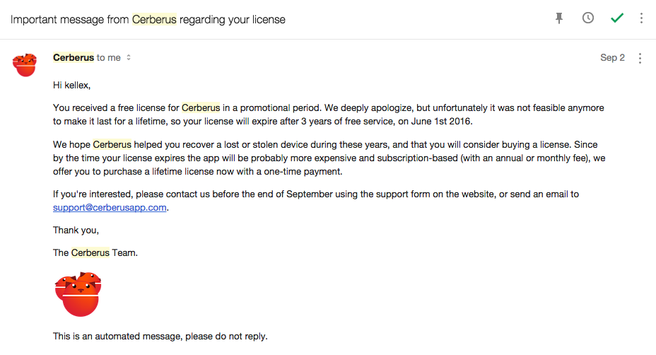 If you had a lifetime subscription that is no longer lifetime, Cerberus will send you an email telling you as much. That email will also tell you when your lifetime subscription ends and then try to explain to you how important their anti-theft features are to your life in hopes that you will then pay for a license. But not only that, they want you to know that if you don’t pay for a license today, be prepared (assuming you care and want to keep using their services) to pay even more in the future! Yep, if you don’t pay today, you will probably have to pay a monthly or subscription fee before long.