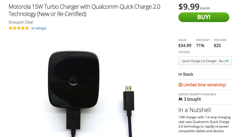 So if you haven’t picked one up, we wanted to point out that the Groupon deal for Motorola’s Turbo Charger is back. You can grab a re-certified version for just $9.99 or pick up a brand new one for $14.99. These originally retailed for around $35, so we’re talking a significant discount. And at $9.99, you are even getting a better price than the off-brand adapters Amazon is selling.