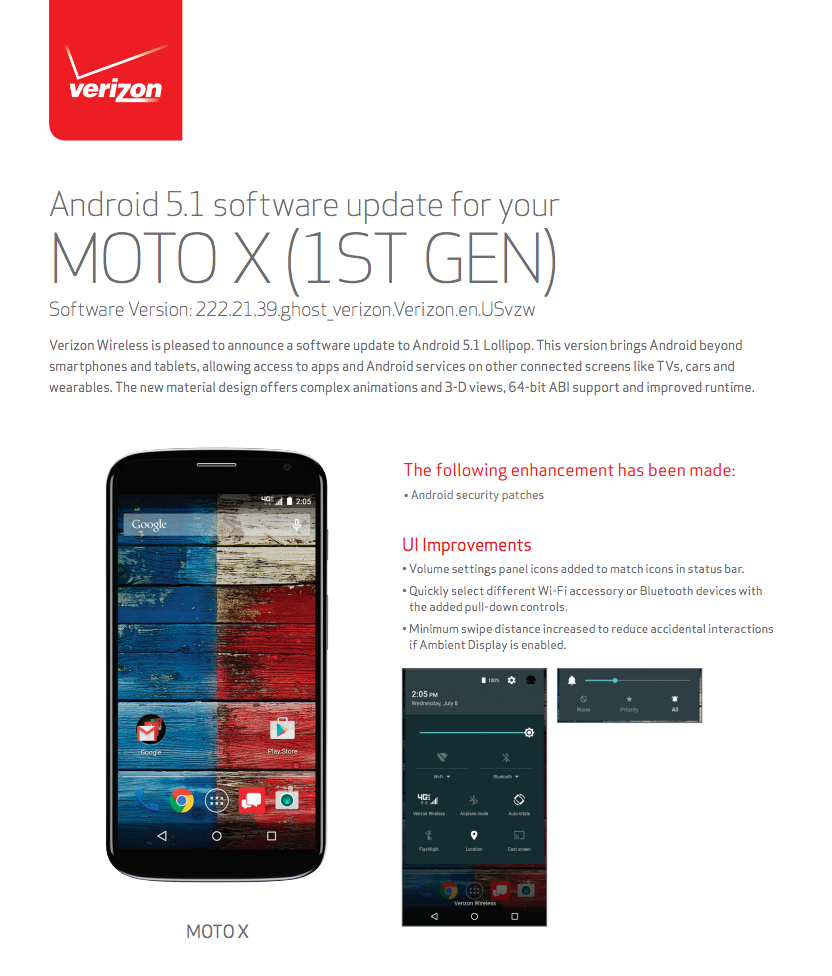 Over the weekend, Motorola began a soak test of Android 5.1 Lollipop for the Moto X (1st gen) on Verizon. At the time, we told you that it could begin rolling out to non-soak testers within the week, assuming it was successful. Well, Verizon must be pleased with the Lollipop build, as they have approved the update for rollout.