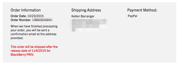 Blackberry says these pre-orders “will be shipped after the release date of 11/6/2015.” At least, that’s what our pre-order confirmation says.