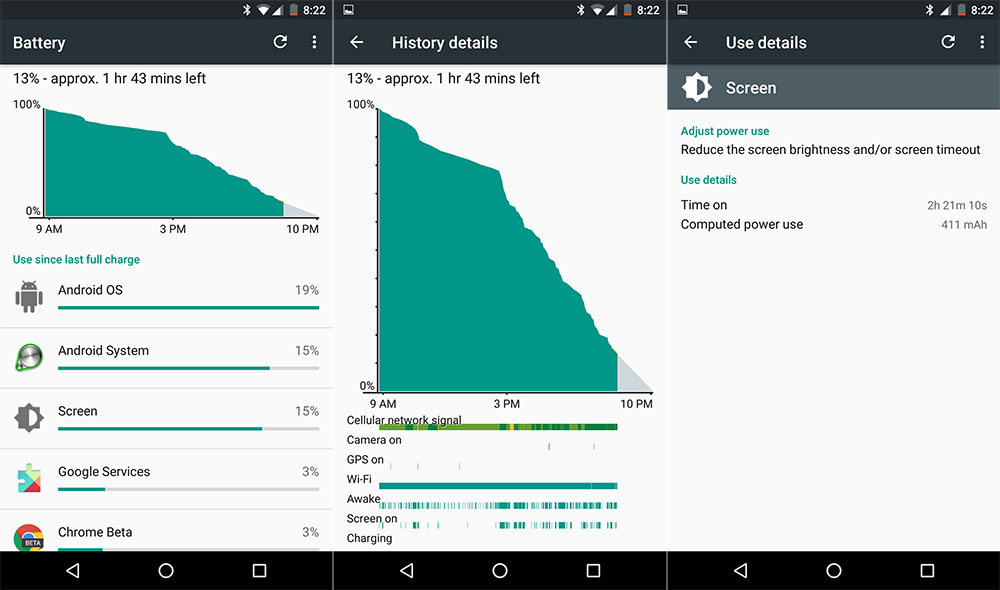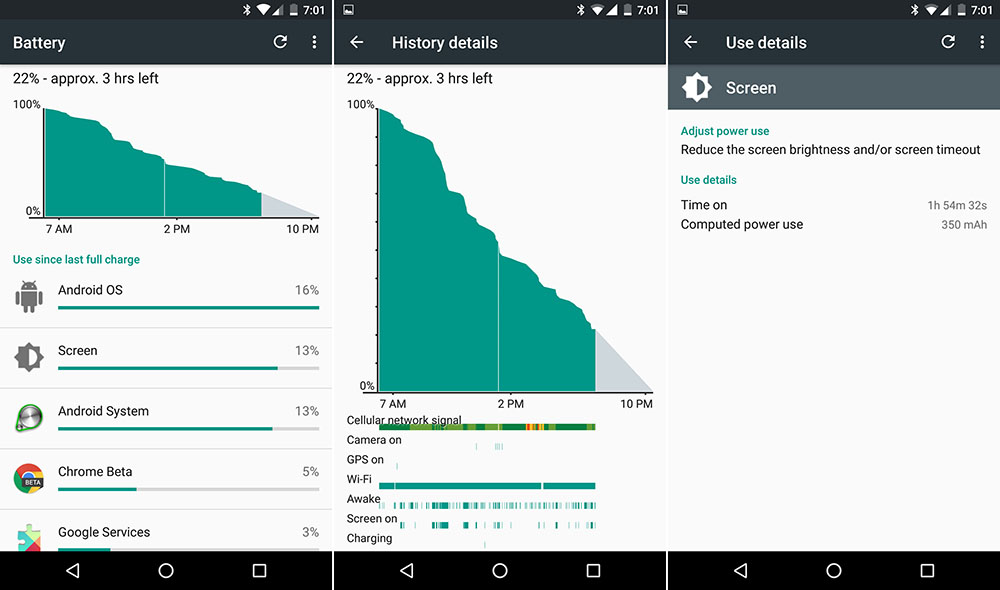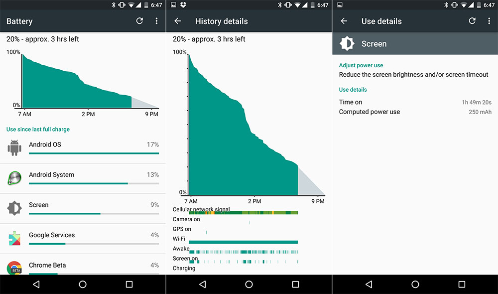 Now, there are a whole bunch of factors here that could affect battery life. Maybe my T-Mobile signal in NYC was terrible the whole time (I don’t think it was) or maybe this build of Android 6.0 is super buggy (it’s still this odd MDB08G because Google hasn’t sent my review unit an update). I definitely didn’t ever see much of the Doze action you’ll see if you do a quick search on Google+, where people are showing their phone’s battery life flat-lining for hours as it sits idle. So maybe I have an app that is keeping the phone alive in the background and not letting Doze do its thing.